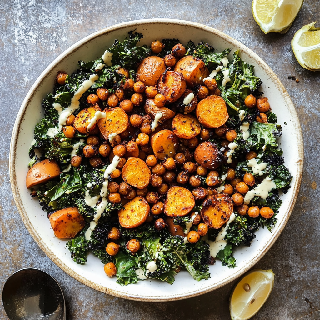 Irresistible Kale Caesar Salad with Sweet Potatoes & Crispy Chickpeas