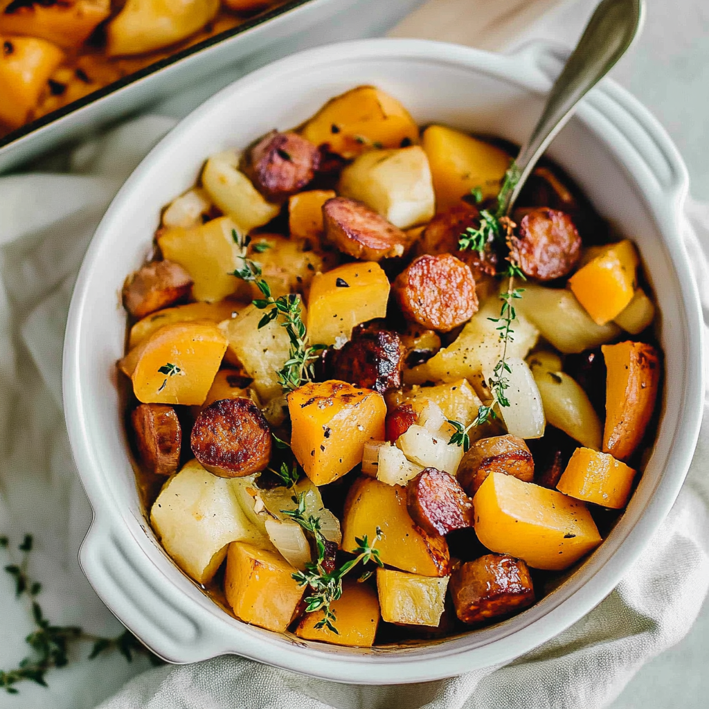 Start by browning the sausage in a large skillet, allowing those savory juices to develop. As the sausage cooks, chop the butternut squash and prepare your spices. Once the sausage is ready, toss in the squash and roast everything together for optimal flavor.