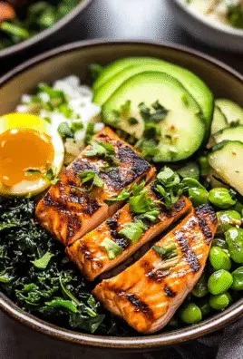 Delicious Grilled Salmon Bowl with Garlicky Kale Recipe