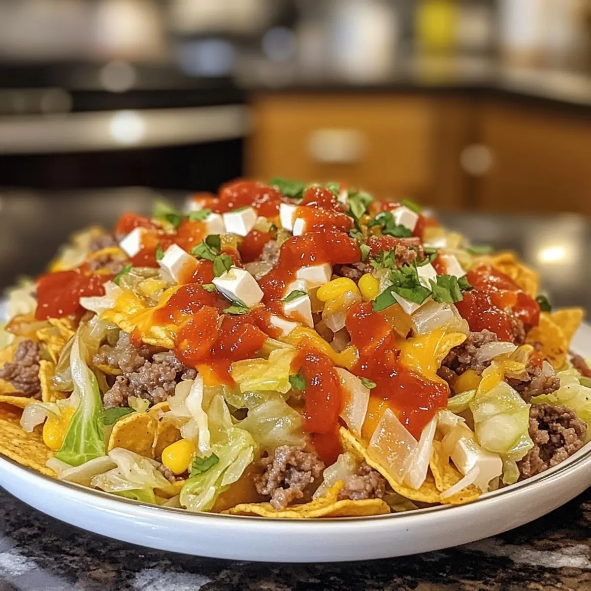 - Serve: Just before serving, sprinkle the reserved Fritos on top to keep that delightful crunch. Enjoy fresh for the best texture!