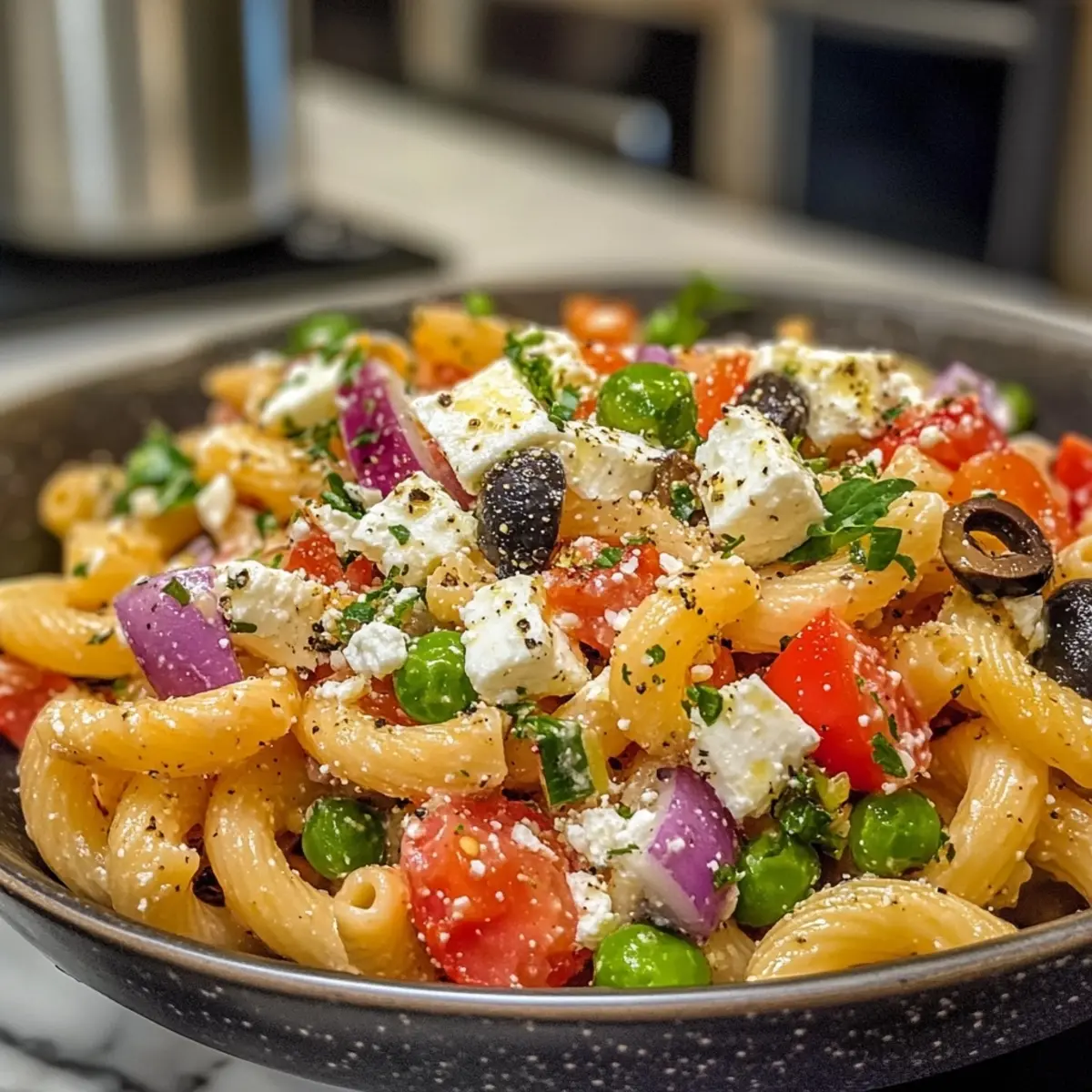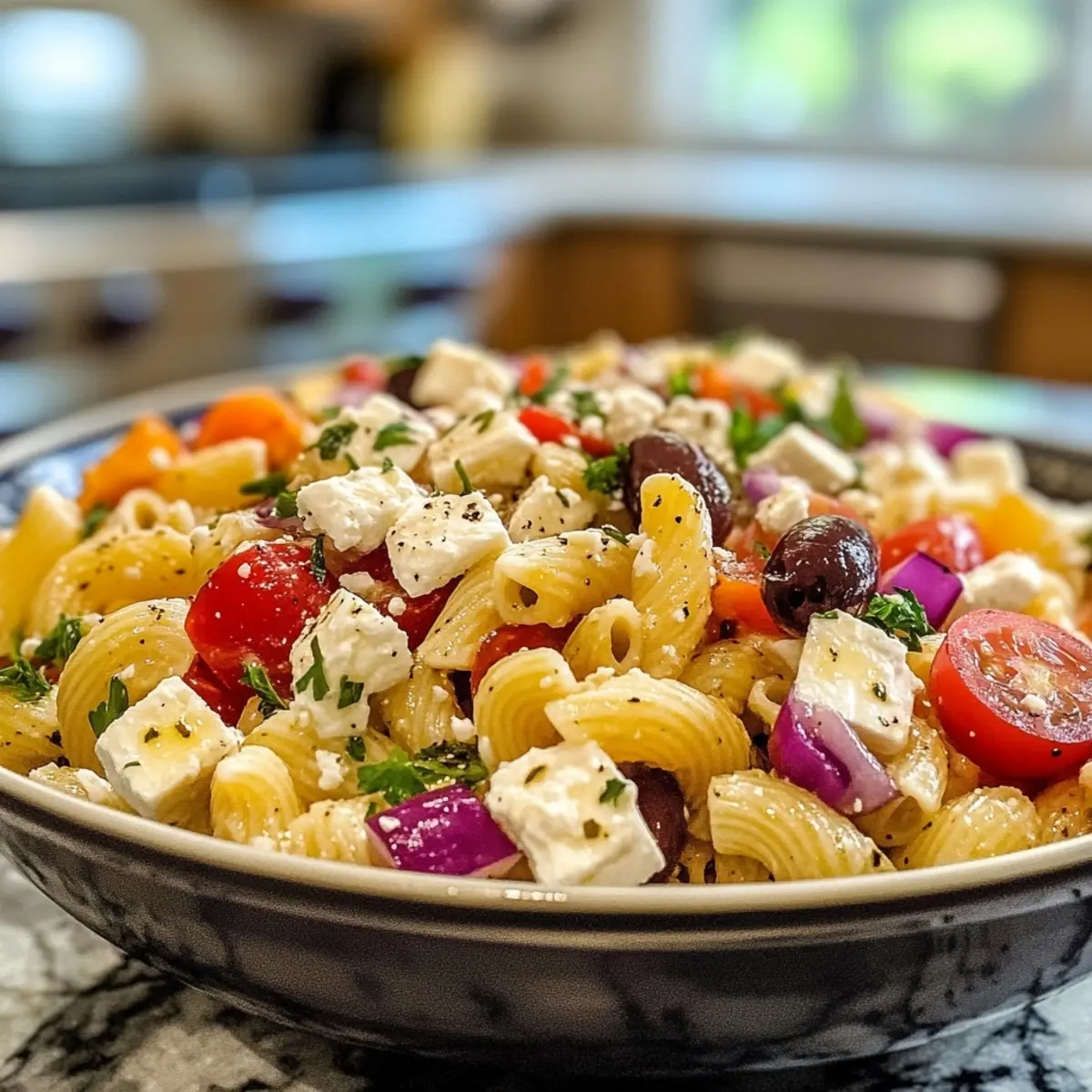 4. Combine Ingredients: In a large mixing bowl, add the cooled pasta, chopped vegetables, Kalamata olives, and feta cheese. Drizzle the dressing over the top and toss gently until everything is coated beautifully.