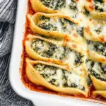 Spinach ricotta shells are a delicious Italian dish made with large pasta shells stuffed with a creamy mixture of ricotta cheese, fresh spinach, and various seasonings. The shells are then baked in marinara sauce and topped with mozzarella cheese, creating a comforting and satisfying meal. enjoy with creamy baked potato soup This dish is perfect for family dinners or entertaining guests, as it’s both visually appealing and packed with flavor.