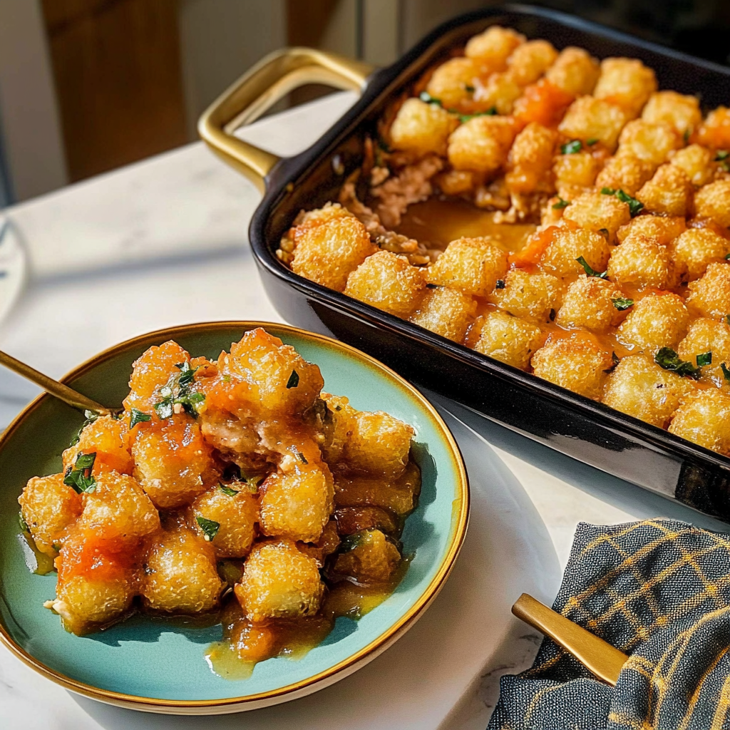 - Its visual appeal is irresistible as golden tots crown a colorful medley of ingredients.
