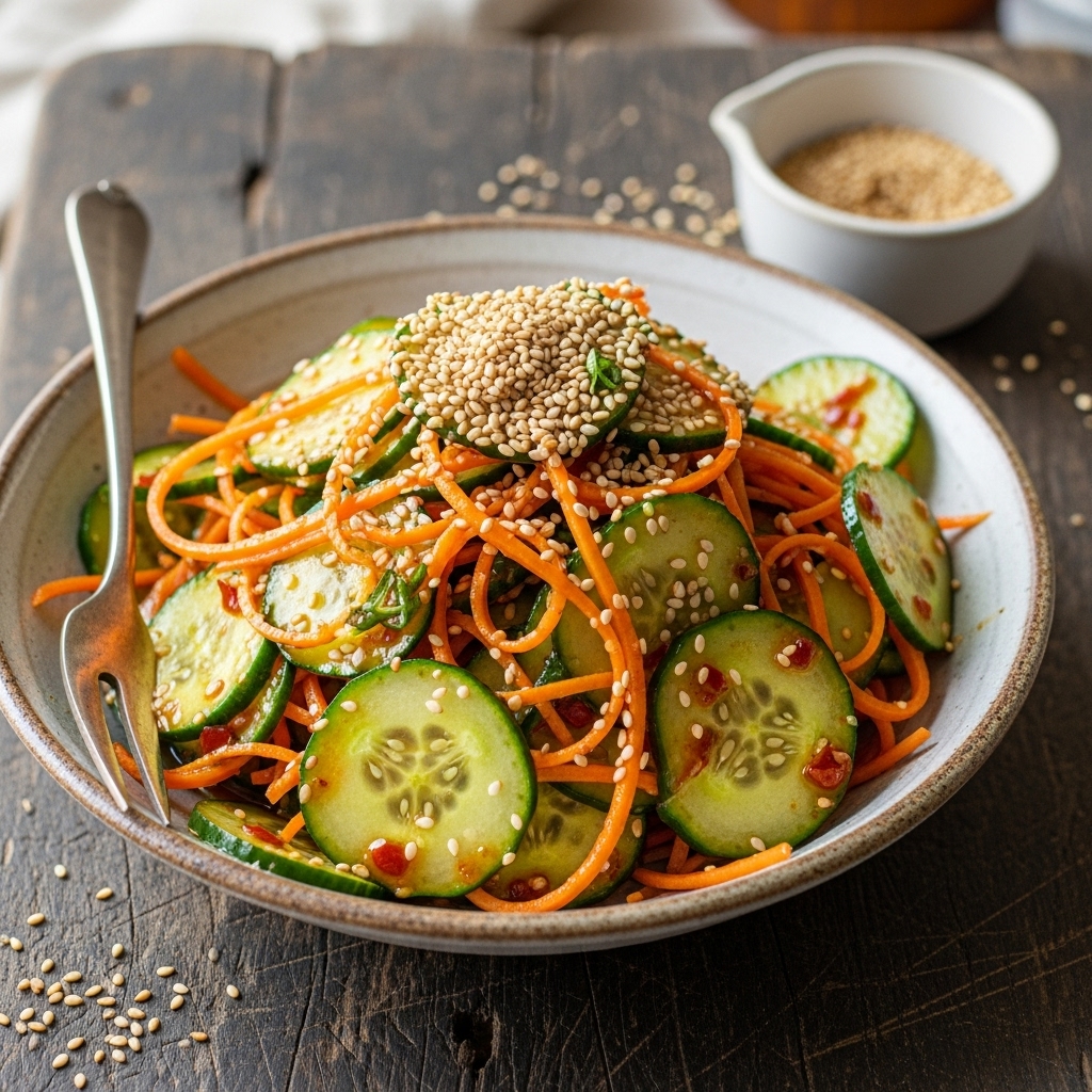 Making Spicy Sesame Cucumber Carrot Salad is simple and quick. Start by julienning the cucumbers and carrots into thin strips. In a bowl, mix sesame oil, soy sauce, rice vinegar, minced garlic, and chili flakes to create the dressing. Toss the cucumbers and carrots in this dressing until they are well coated. Finally, sprinkle sesame seeds on top for an added crunch. Allow it to marinate for about 10 minutes before serving to let the flavors meld together beautifully.