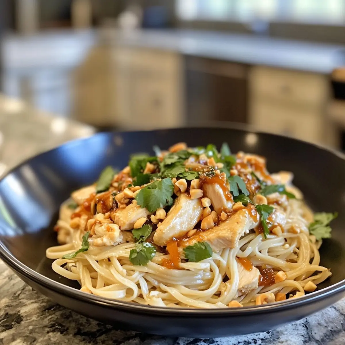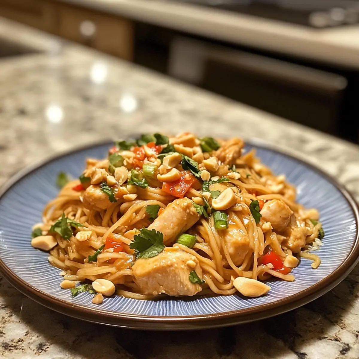 - Plate your Thai Peanut Chicken Noodles and garnish with chopped peanuts and fresh cilantro. Serve with lime wedges for an added burst of flavor.
