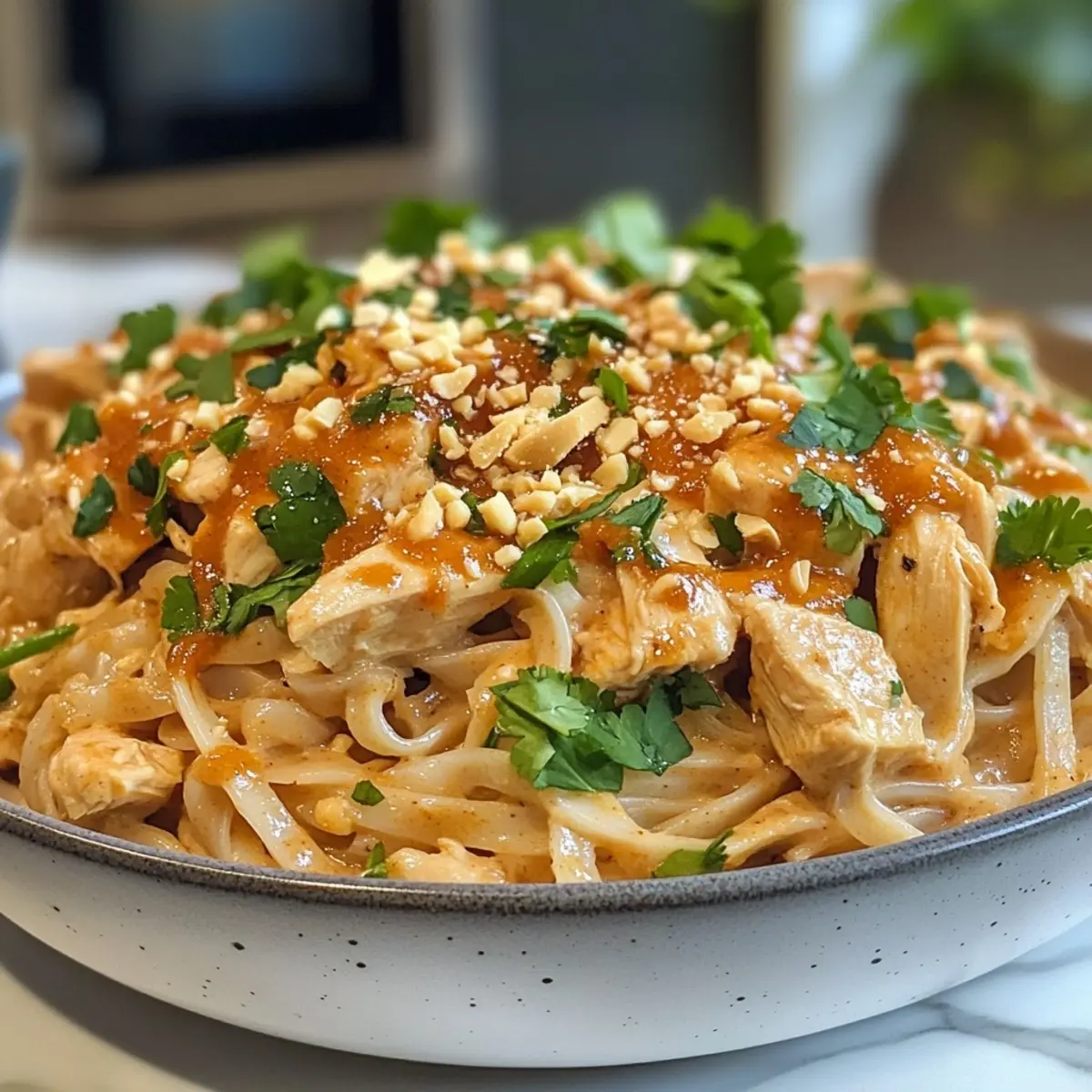 - Serve: Plate your Thai Peanut Chicken Noodles and garnish with chopped peanuts and fresh cilantro. Serve with lime wedges for an added burst of flavor.